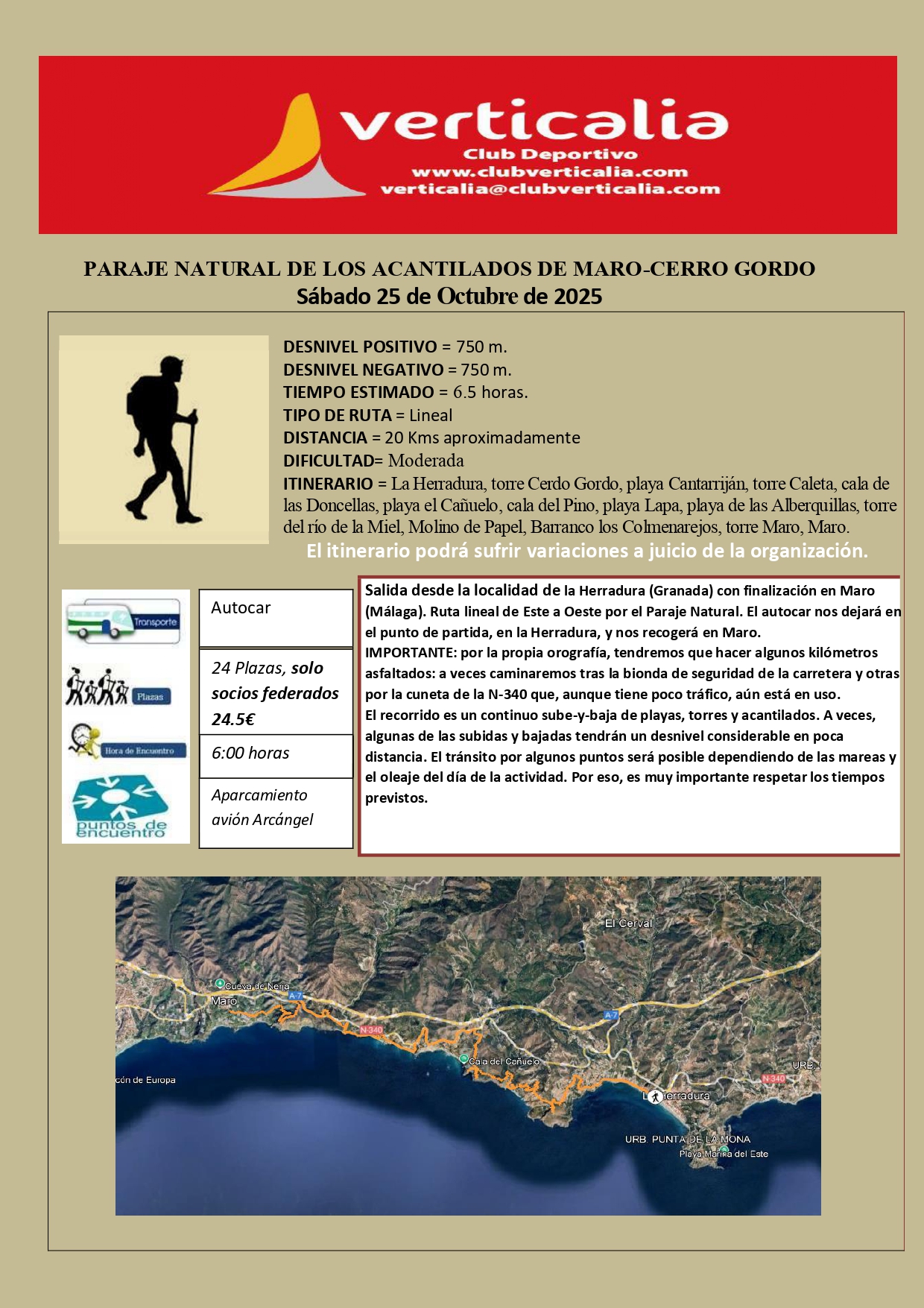 El recorrido será: La Herradura, Torre Cerro Gordo, Playa Cantarriján, Torre Caleta, Cala de las Doncellas, Playa El Cañuelo, Cala del Pino, Playa Lapa, Playa de las Aberquillas, Torre del Río de la Miel, Molino de Papel, Barranco Los Colmenarejos, Torre de Maro, Maro.